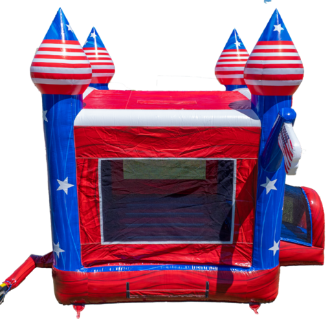 This eye-catching 13’x13’ red, white, and blue inflatable bounce house features bright patriotic colors, star accents, and castle towers that make it perfect for any celebration. Whether you're hosting a birthday party, school event, church festival, corporate picnic, or 4th of July celebration, this bounce house brings energy and excitement to every event.